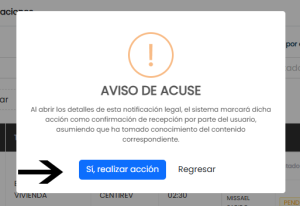 4. Se te mostrará un aviso el cual informa que al abrir los detalles se marcará la acción como confirmación de recepción de tu parte, haz click en SÍ, REALIZAR ACCIÓN