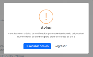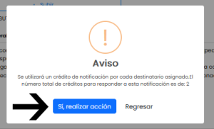 5. Si seleccionaste FIRMAR Y NOTIFICAR, se requerirá tener el número necesario de créditos de notificación en base a cada usuario destinatario (1 crédito de notificación por cada usuario destinatario). Haz click en el botón SÍ, REALIZAR ACCIÓN