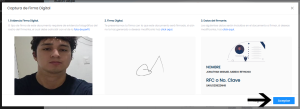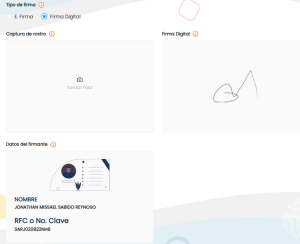 7. En caso de seleccionar Firma Digital, se te solicitará capturar una foto de tu rostro y verifica que tus datos personales así como tu firma digital sea la correcta, haz click en el botón ACEPTAR