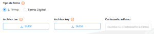 10. En caso de seleccionar e.FIRMA, sube tus archivos .cer, .key y escribe la contraseña de tu e.FIRMA