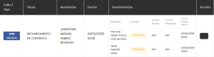 1. Se te mostrará una lista con el historial de las notificaciones legales que hayas creado o estés asignado, cada elemento cuenta con la descripción del Folio, Titulo, Remitente, Fecha de creación, detalles de cada destinatario los cuales son el nombre, estado (pendiente, recibida, o en rebeldía), la fecha en la que consultó los detalles si es el caso, la fecha en la que entró como una actitud de rebeldía si es el caso, la fecha en la que se le emitió el último aviso vía correo electrónico y SMS