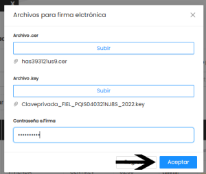 6. En caso de seleccionar Firma Electrónica sube tus archivos .cer, .key y la contraseña de tu e.FIRMA, haz click en el botón ACEPTAR