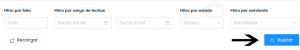 2. Puedes realizar una búsqueda específica a través de los filtros por folio, rango de fechas, por estado y por el usuario remitente de la notificación, una vez seleccionado tus filtros, haz click en BUSCAR