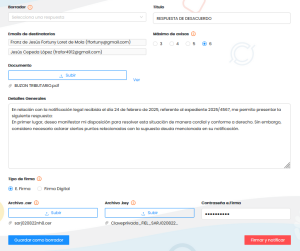 3. Llena todos los campos, y haz click ya sea en GUARDAR COMO BORRADOR (en caso de guardar pero aún no notificar) o en FIRMAR Y NOTIFICAR según lo requieras. Importante: los documentos que pueden subirse son solo del tipo PDF. Otros tipos de documentos generan errores e impiden procesar las respuestas.
