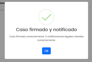 15. Espera a que termine el proceso de carga y se te mostrará un mensaje el cual indicará si tu notificación legal fue guardada o firmada/notificada según la acción que hayas elegido, en caso de que haya ocurrido algún error o hayas omitido un campo requerido igual se te informará en el mensaje de alerta.