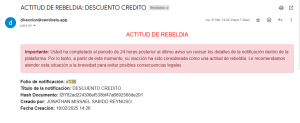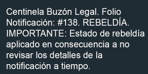 Si 24 horas después del último aviso (para este caso el tercero) el usuario destinatario sigue sin revisar los detalles de la notificación legal, se considerará como una acción de rebeldía de su parte al no querer darse por enterado de la notificación, por lo tanto recibirá un par de alertas para informar dicha acción.