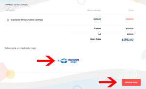 4. Serás dirigido a nuestra sección de pago, revisa los detalles de precio de tu suscripción seleccionada y selecciona el medio de pago (para compras de suscripciones únicamente es aceptable el método de pago a través de Mercado Pago), posteriormente haz click en REALIZAR PAGO
