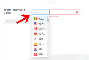 1. Selecciona el código telefónico de tu país, haciendo click sobre el recuadro gris