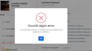 7, Si ocurre algún error, como por ejemplo que tu contraseña actual sea incorrecta, se te mostrará un mensaje de error como el siguiente