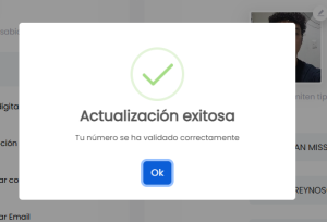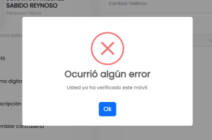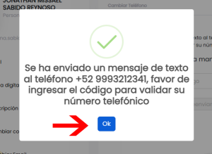 5. Si estas deseando cambiar tu número telefónico o no ha sido validado, se te mostrará un mensaje como el siguiente, haz click en OK