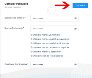 5. Si tu nueva contraseña es válida (cumple con los requisitos solicitados, se habilitará el botón GUARDAR, haz click sobre el