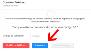 7. Si el SMS no llego a tu dispositivo, haz click en el botón REENVIAR