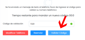 9. Una vez recibido el SMS en tu dispositivo, digita el código en el campo Código de validación y haz click en VALIDAR CÓDIGO
