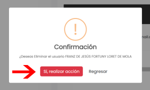 3. Se te mostrará un mensaje de confirmación como el siguiente, haz click en SI, REALIZAR ACCIÓN