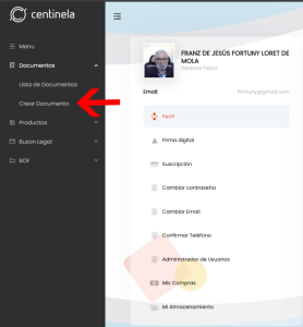 1. Desde la cuenta del usuario vinculado (para este ejemplo usuario Franz Fortuny) desde el menú lateral izquierdo, haz click en DOCUMENTOS y luego en CREAR DOCUMENTO
