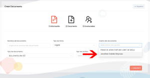 2. Se visualizará un nuevo campo llamado DUEÑO DEL DOCUMENTO, esto permite que el usuario puede seleccionarse así mismo o seleccionar la cuenta de otro usuario donde ha sido vinculado, para este ejemplo seleccionaremos la cuenta del dueño Jonathan Sabido
