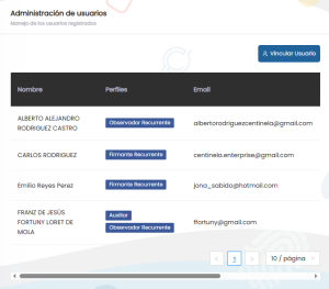 A continuación veremos en la siguiente lista de ejemplo que se tienen a dos usuarios como Firmantes Recurrentes y a otros dos usuarios como Observadores Recurrentes