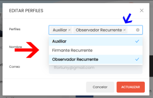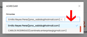 2. Nos mostrará una lista los usuarios que tenemos con esos roles (para este ejemplo estamos usando firmantes recurrentes), añade haciendo click en ellos, puedes seleccionar uno o varios y usar el autocompletado escribiendo su nombre o correo electrónico
