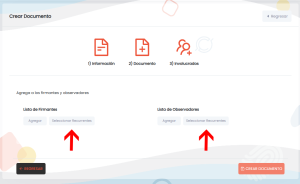 1. En el paso de Involucrados al momento de Crear Documento, haz click en SELECCIONAR RECURRENTES, ya sea para la lista de firmantes u observadores